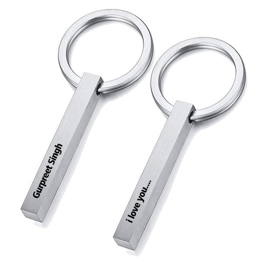Customized 3D Stainless Steel Vertical Bar Keychain – Personalized 4-Side Engraved Gift for Men, Women & Couples